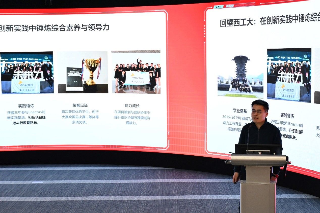 随后,卢海鹏校友以《铸心蓝天,逐梦航发——从西工大到中国航发的成长之路》为题,结合自身从校园到国家重点科研单位的成长历程,从夯实专业基础、坚定职业选择、锤炼实战能力、胸怀家国理想四个方面进行了生动分享。卢海鹏校友曾获公司优秀共青团干部、青年岗位能手、十大杰出青年等荣誉,其成长路径为立志服务国防科技事业的同学们树立了鲜活榜样。