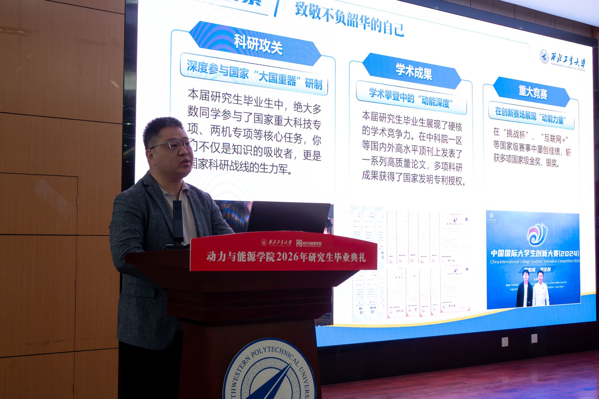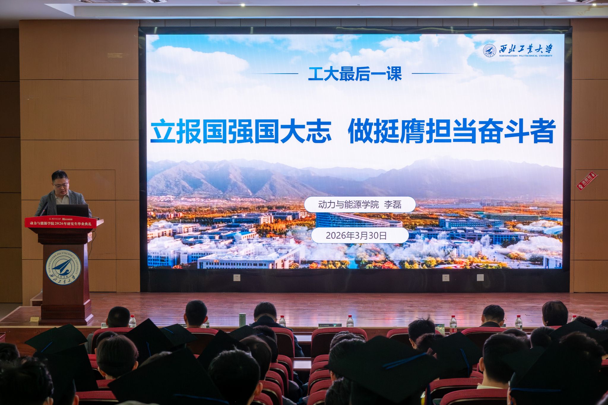 以“立报国强国大志,做挺膺担当奋斗者”为主题,为全体2026届硕博毕业生举办了“工大最后一课”。本次课程由学院党委书记李磊主讲,旨在引导毕业生坚定理想信念、厚植家国情怀,传承西工大“总师育人文化”。